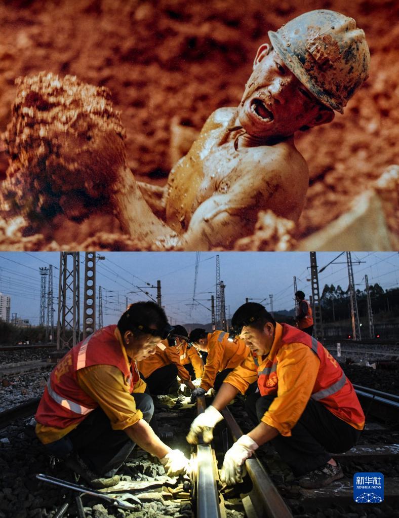 拼版照片:上图为1993年南昆线上一名铁路工人在清理淤泥(资料图片,中国铁路南宁局集团有限公司提供);下图为中国铁路南宁局集团有限公司百色工务段工人在维修铁轨(新华社记者张爱林2021年4月30日摄)。