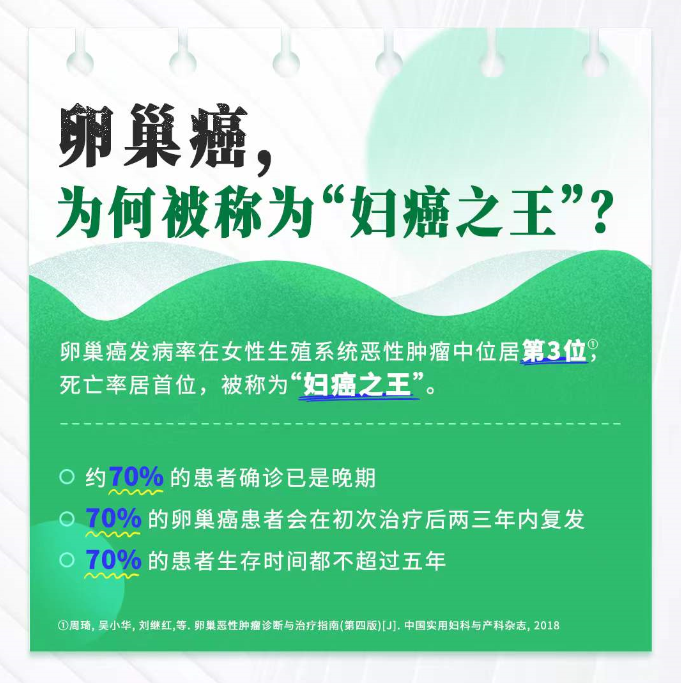 长期以来,临床上三个70%困扰着临床医生和卵巢癌患者:约70%的患者确诊时已是晚期;尽管手术联合含铂化疗一线治疗缓解率可达80%以上,但70%的卵巢癌患者会在初次治疗后两三年内复发;70%的患者生存时间都不超过五年。