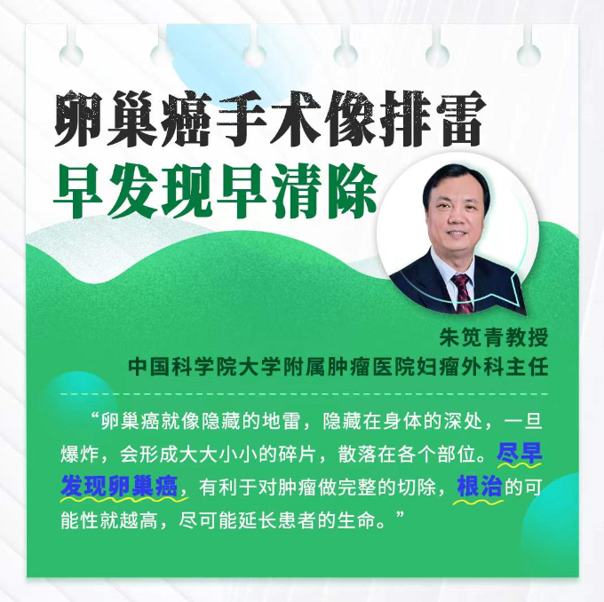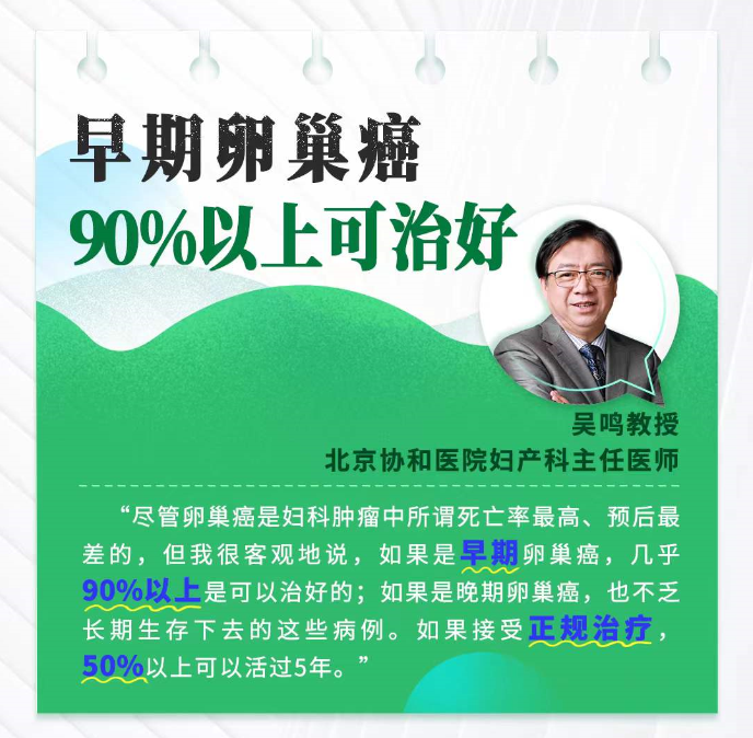 吴鸣教授指出:“尽管卵巢癌是妇科肿瘤中死亡率最高、预后最差的疾病,但早期卵巢癌90%以上可以治好,而晚期卵巢癌也不乏长期生存的病例,如果接受正规治疗,50%以上能活过5年。”