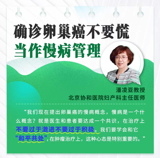 如今,卵巢癌的治疗已经进入了慢病化管理时代。“我们现在提出卵巢癌的慢病管理观念,就是医生和患者要达成共识,在治疗上不要过于激进,要学会和它和平共处,在肿瘤治疗上这种心态特别重要。”北京协和医院妇产科主任医师潘凌亚教授强调,“抗癌之路是一场持久战,要做好长期作战的准备。正确看待疾病,并且慎重地迈出第一步,选择一个正确的医院、正确的医生、正确的治疗办法,这是卵巢癌新患者们要做的第一件事。在今后抗癌的过程中,要和家人一起,用不竭的勇气、智慧和耐心来彼此照顾,一同坚持下去。”