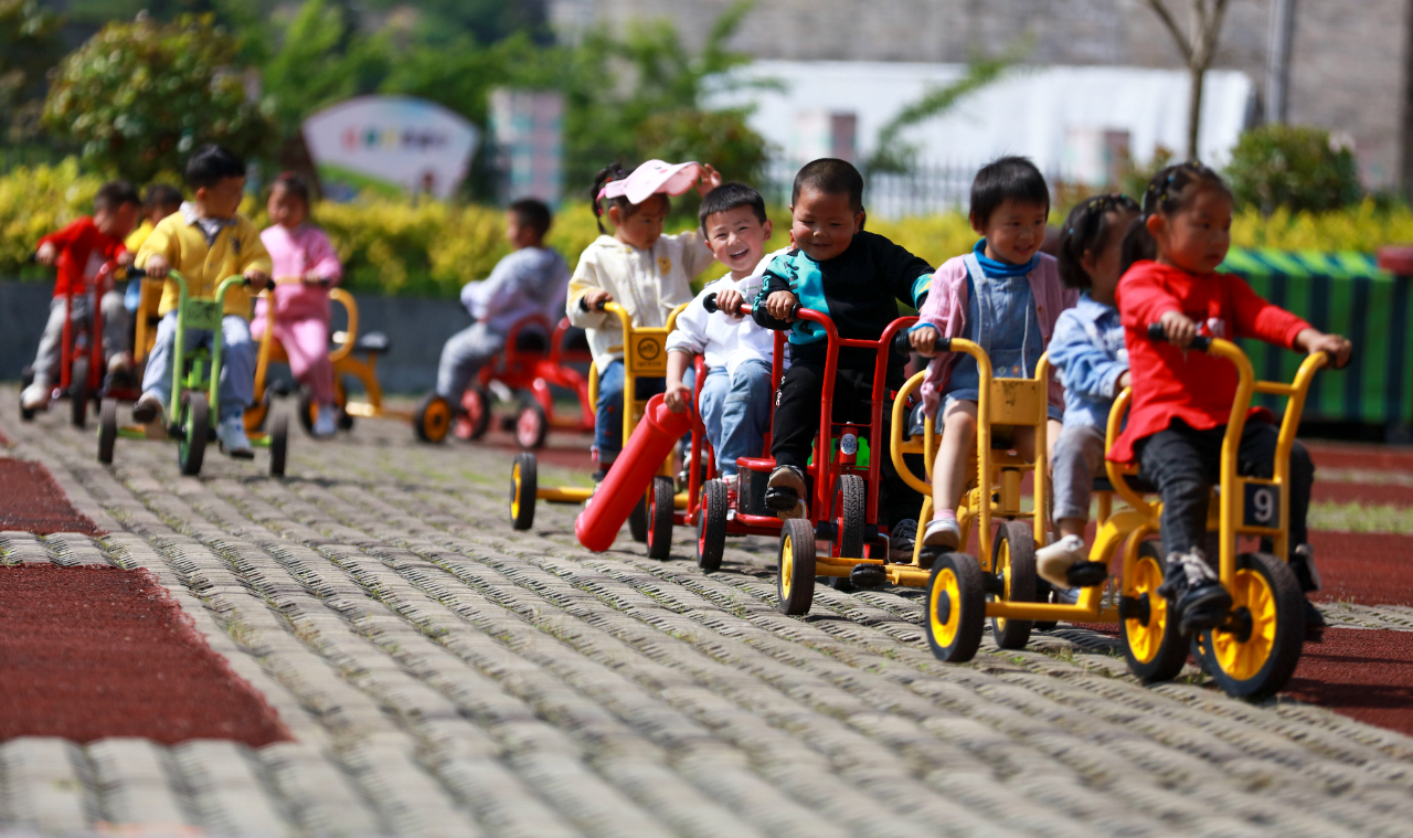 5月10日,贵州省黔西市甘棠镇中心幼儿园的小朋友进行骑车分组比赛。