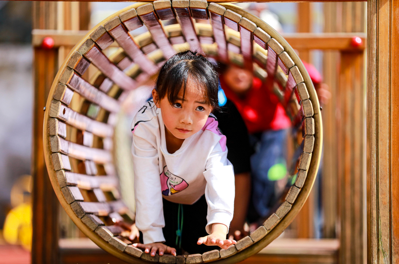 5月10日,贵州省黔西市甘棠镇中心幼儿园的小朋友进行分组钻隧道比赛。