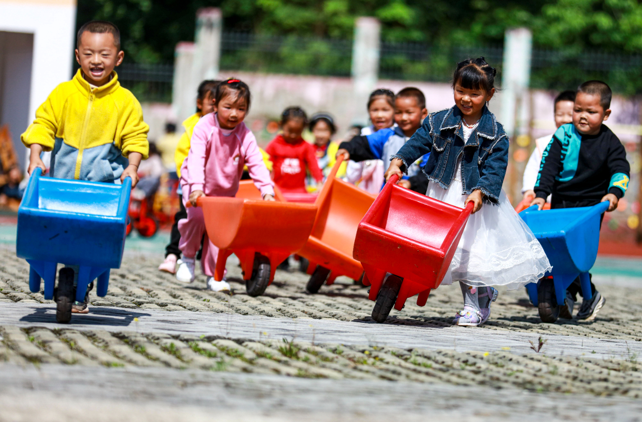 5月10日,贵州省黔西市甘棠镇中心幼儿园的小朋友进行手推车分组比赛。周训超 摄