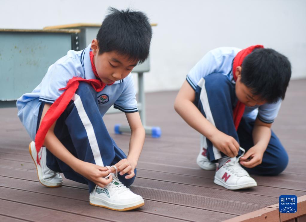 5月11日,湖州吴兴区飞英街道飞英小学学生进行系鞋带比赛。