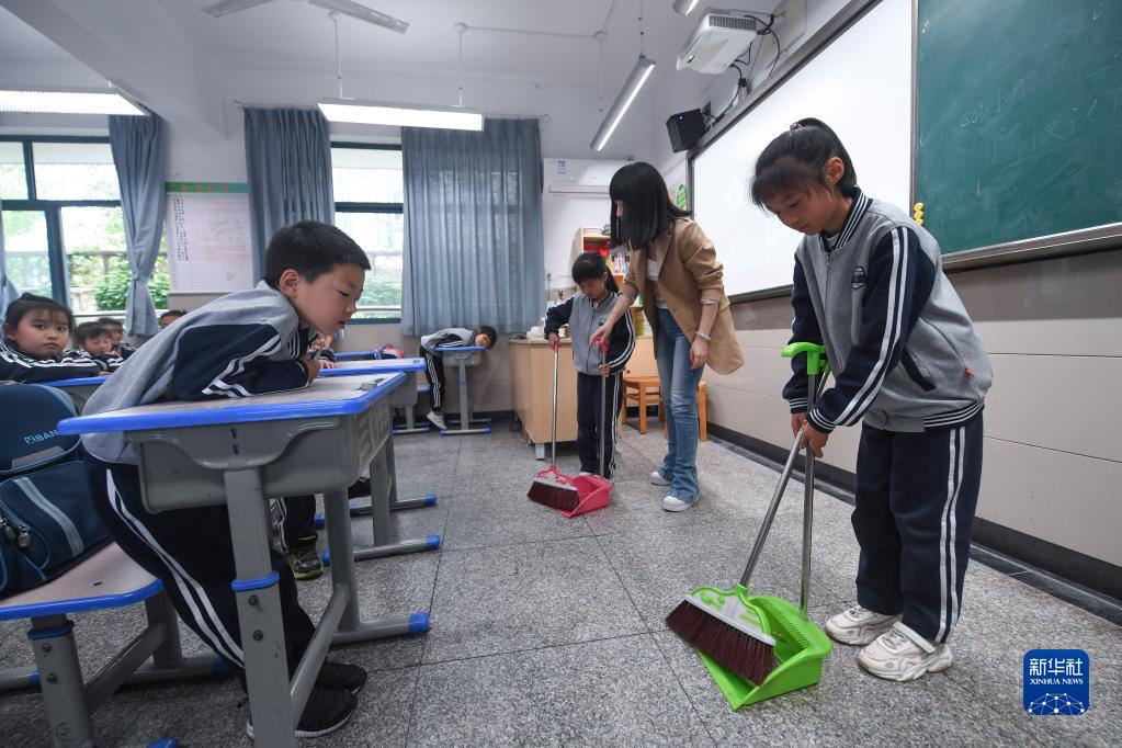 5月11日,湖州吴兴区飞英街道月河小学一年级学生在老师的带领下学习正确使用清扫工具。