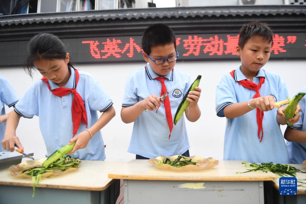 5月11日,湖州吴兴区飞英街道飞英小学学生参加劳动教育课的“技能大比拼”,比赛给黄瓜削皮。