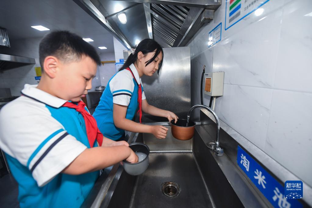 5月11日,湖州吴兴区飞英街道月河小学六年级学生学习淘米煮饭。