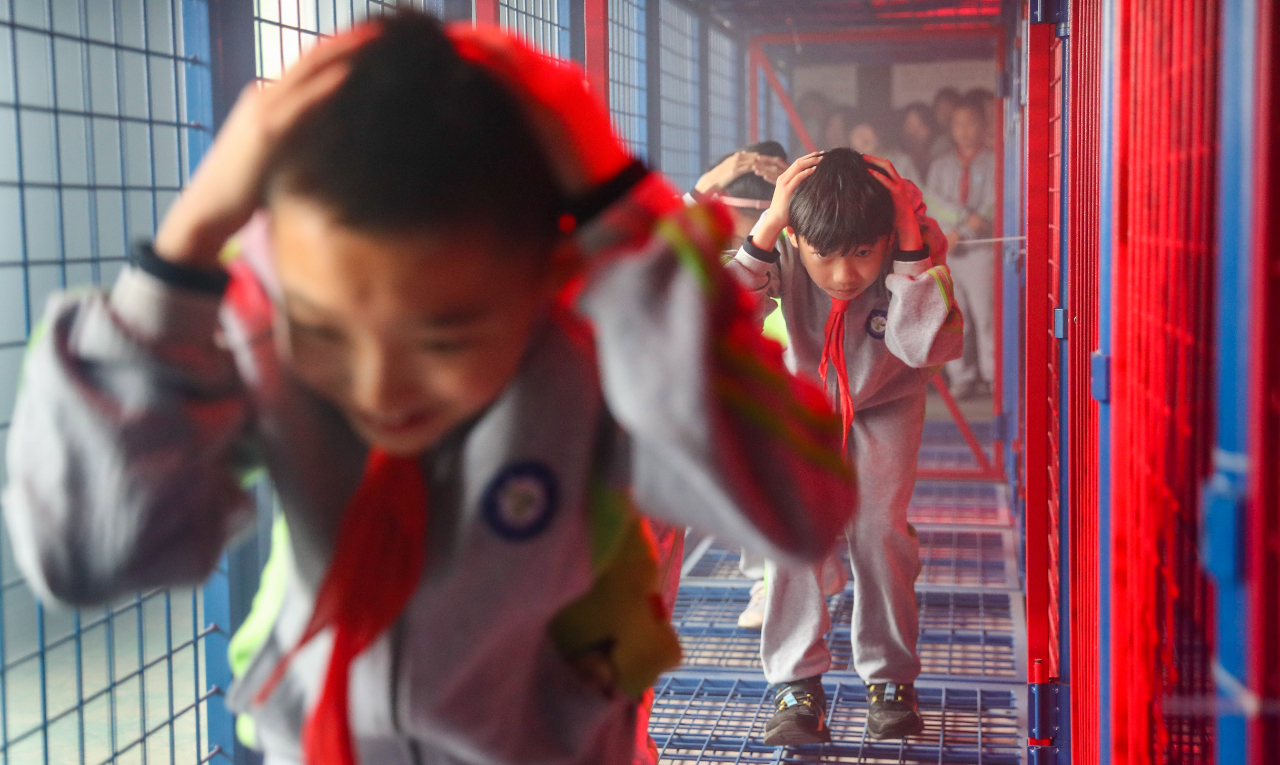 5月10日,浙江省湖州市德清县钟管小学的学生在进行浓烟环境下的逃生演练。在“5·12”全国防灾减灾日到来前夕,浙江省湖州市德清县钟管小学开展“防灾减灾记心间”主题活动,组织学生走进当地消防综合应急救援队,了解防灾减灾相关知识,提高应急避险与自救互助能力。王树成 摄