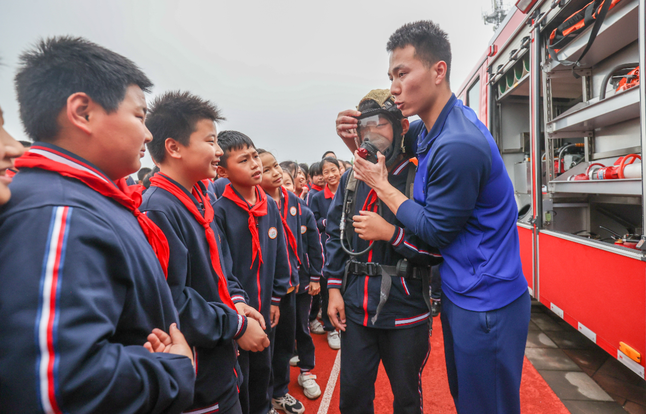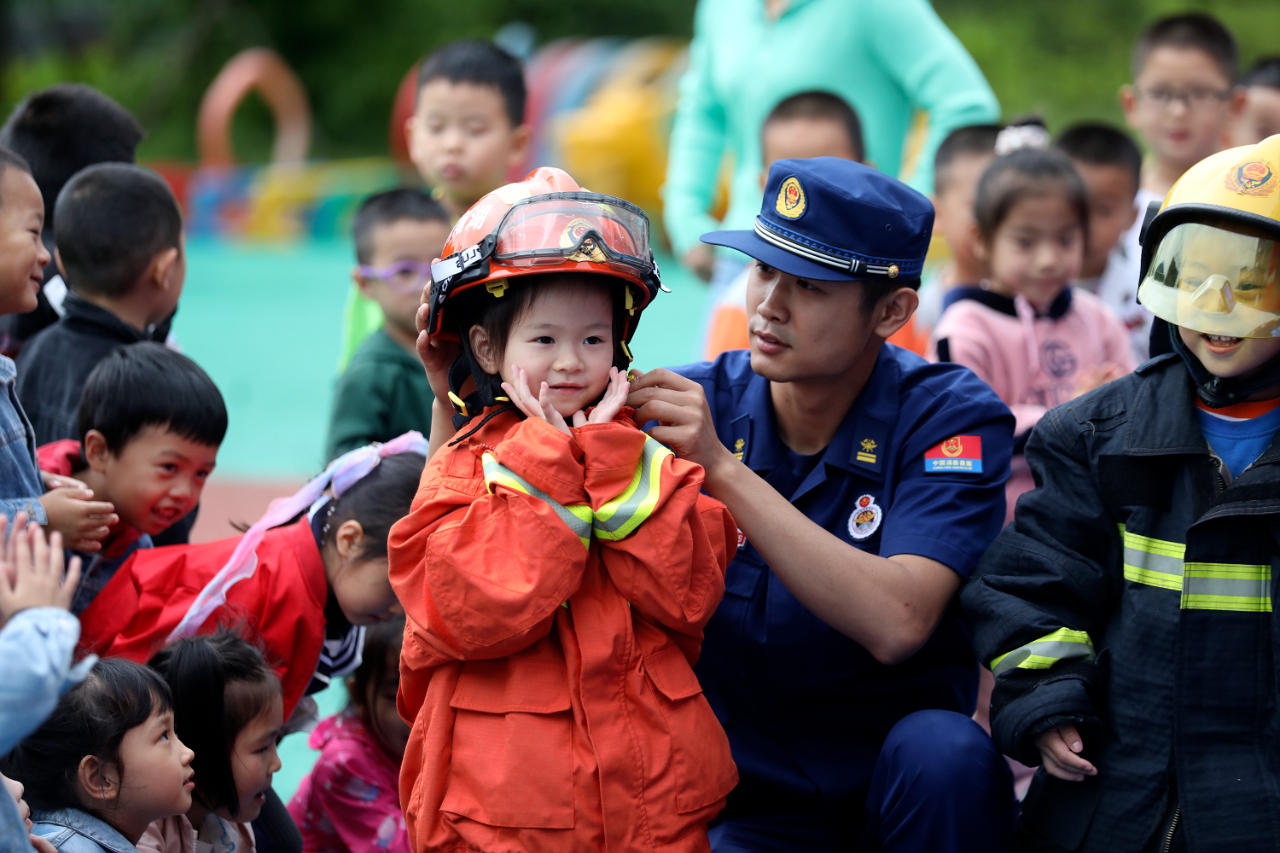 5月11日,在湖南省资兴市鲤鱼江幼儿园,消防员指导小朋友们试穿抢险救援服。在第14个全国防灾减灾日到来前夕,湖南省资兴市鲤鱼江幼儿园联合资兴市消防救援大队开展“防灾减灾教育进校园”主题活动,通过学习使用消防设备、火场逃生演练等活动,向小朋友们普及防灾减灾知识,增强他们的灾害避险自救能力。李科 陈彦林 摄
