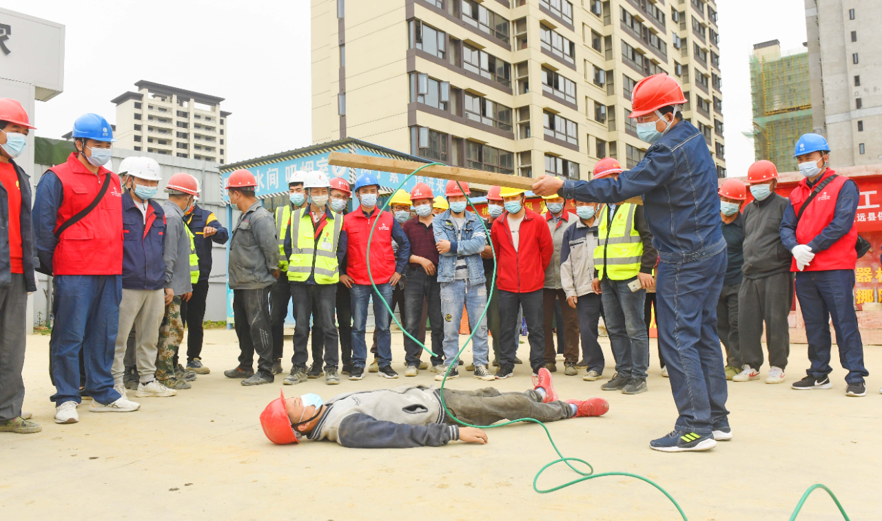 5月10日,在安徽省滁州市定远县一建设工地上,安徽省滁州市定远县供电公司专职安全人员为建筑工人们进行现场触电心肺复苏急救培训。当日,为提高建筑工地上的建设者防灾减灾和安全用电意识,安徽省滁州市定远县供电公司专职安全人员深入全县建筑工地开展“识别灾害风险,掌握减灾技能”为主题的“5.12”防灾减灾日宣传咨询活动,通过现场触电急救培训、用电安全常识和防灾减灾知识技能讲座,向建筑工人多形式、多角度的宣讲防震减灾、防触电、防雷电等方面的知识,增强建筑工人在施工现场的防灾减灾意识,提高事故防范和应急自救能力,迎接“全国防灾减灾日”的到来。宋卫星 曹勇 摄