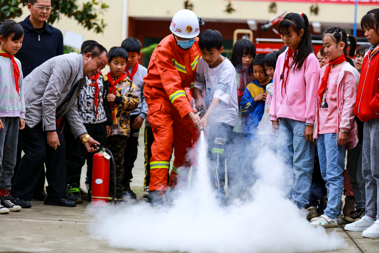 5月9日,在贵州省黔西市雨朵镇沈场小学消防员指导学生体验灭火器的使用。
