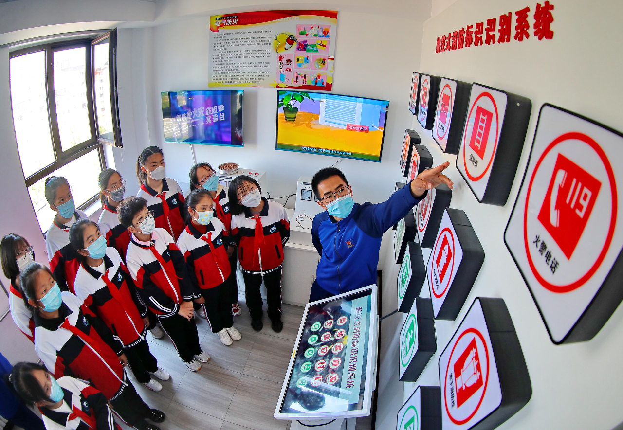 5月11日,河北省秦皇岛市海港区海滨路消防救援站消防科普教育基地内,海港区消防救援大队消防指战员指导海港区青云里小学学生学习消防科普知识。当日,河北省秦皇岛市海港区青云里小学联合海港区消防救援大队开展“上好一节消防课”活动。该活动由学校教师带领学生走进秦皇岛市海港区海滨路消防救援站,由消防指战员带领学生参观消防车、消防设备、消防科普教育基地等,为学生普及消防安全和应急自救的知识,增强学生防灾减灾的意识,迎接“全国防灾减灾日”。曹建雄 摄