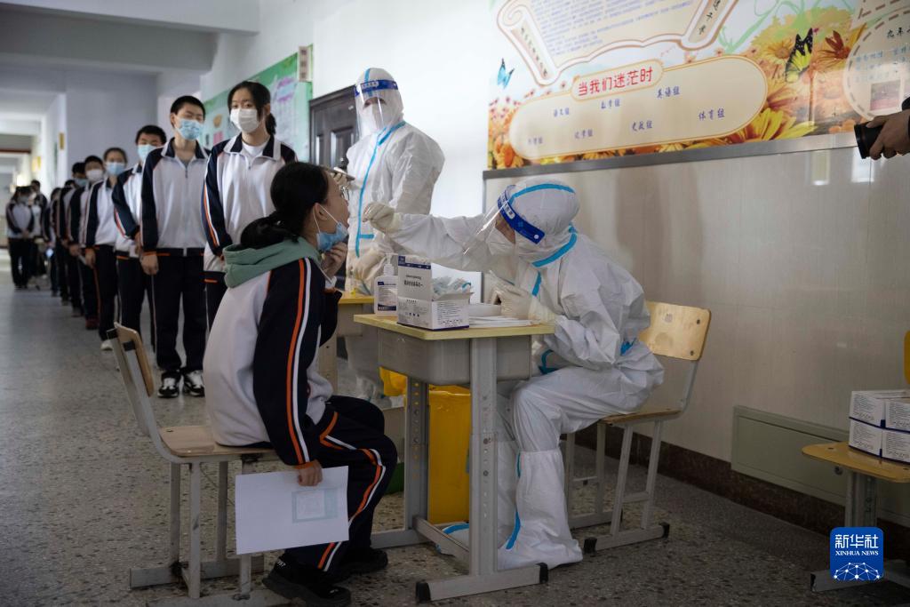 5月12日,在哈尔滨市第六十中学,学生接受核酸采样。