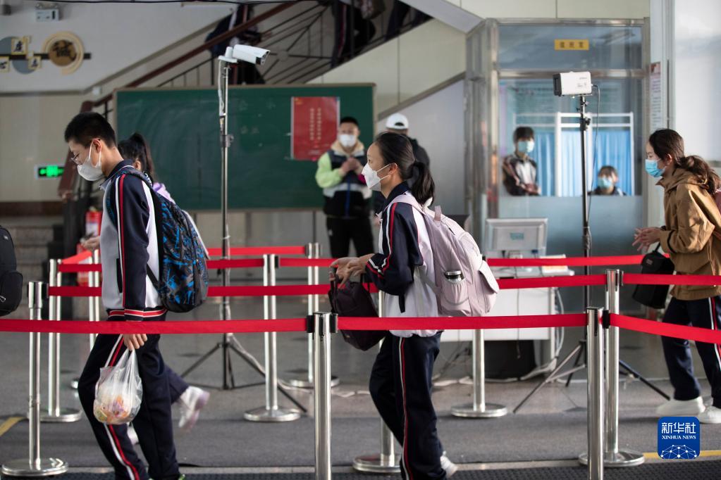 5月12日,在哈尔滨市第六十中学,学生有序进入教学楼。