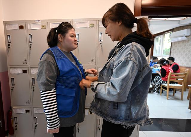 在天津市和平区的爱众残疾人阳光工场,残障学员君君(化名)(左)在母亲的帮助下换衣服(5月13日摄)。新华社记者 赵子硕 摄