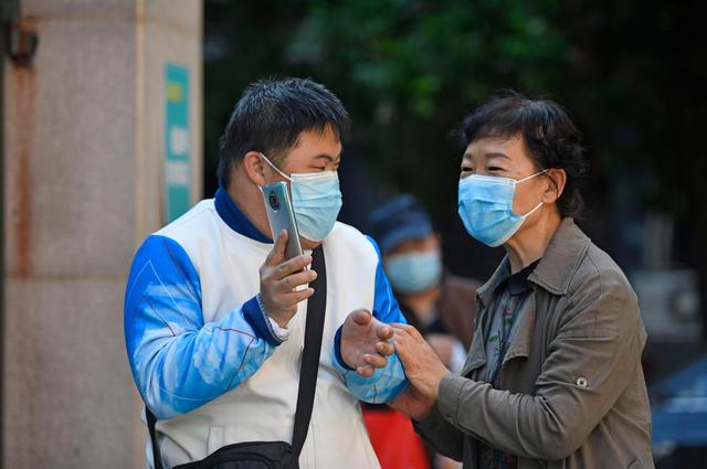 在天津市和平区的爱众残疾人阳光工场入口处,一名残障学员(左)在上班前向辅导员出示健康码(5月13日摄)。新华社记者 赵子硕 摄