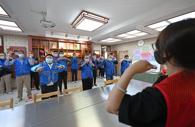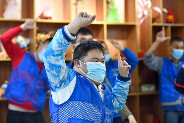 在天津市和平区的爱众残疾人阳光工场,残障学员在练习健身操(5月13日摄)。新华社记者 赵子硕 摄