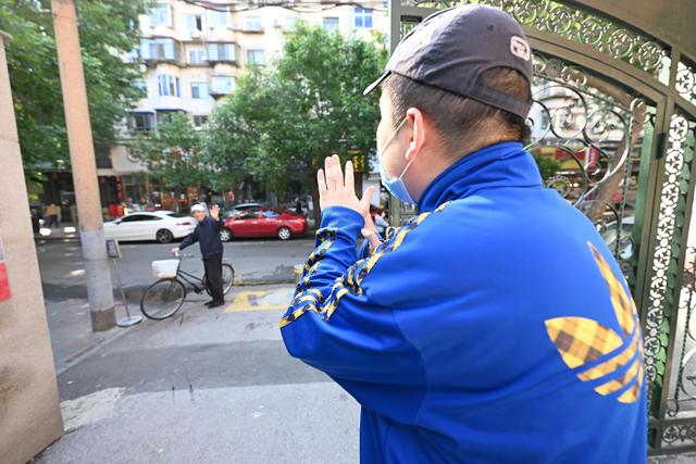 在天津市和平区的爱众残疾人阳光工场入口处,一名残障学员在向家长挥手告别(5月13日摄)。新华社记者 赵子硕 摄