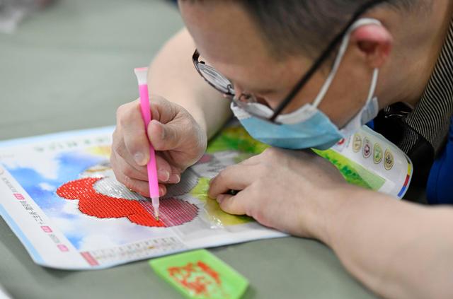 在天津市和平区的爱众残疾人阳光工场,一名残障学员在制作钻石画(5月13日摄)。新华社记者 赵子硕 摄