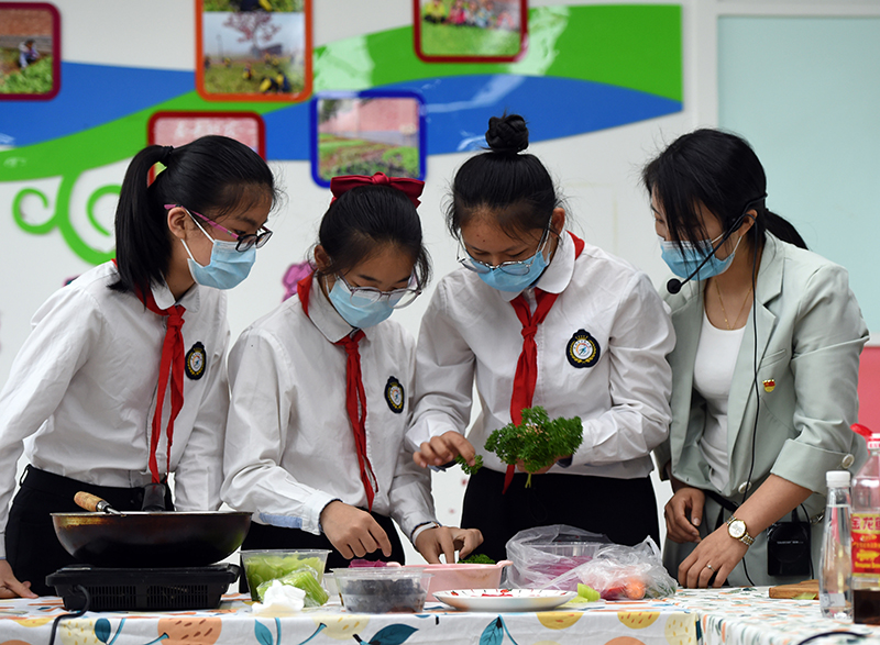 5月11日,在合肥市方桥小学,老师(右一)在劳动实践课上指导学生们学习烹饪技能。