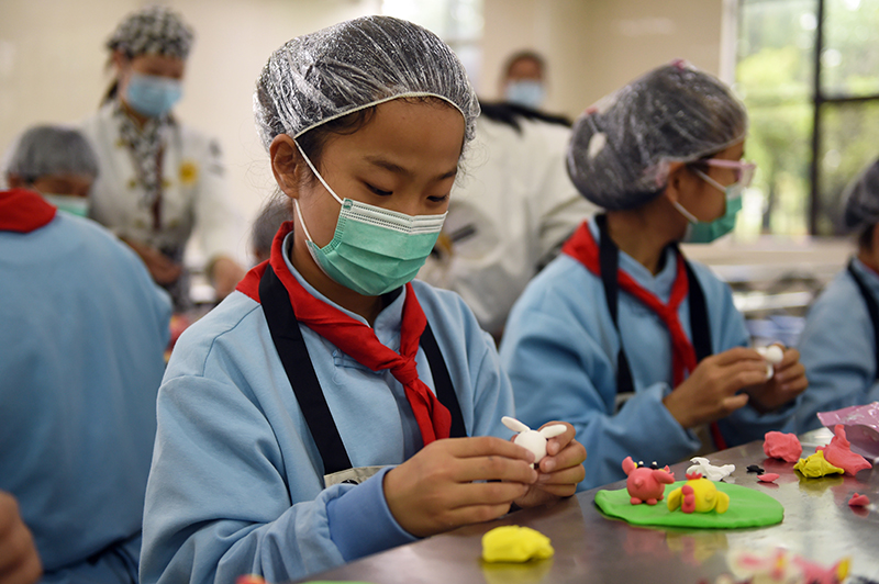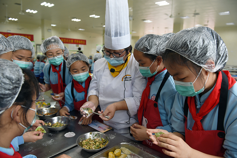 5月11日,合肥市天水路小学的学生们在社团课上跟着厨师学习包饺子。