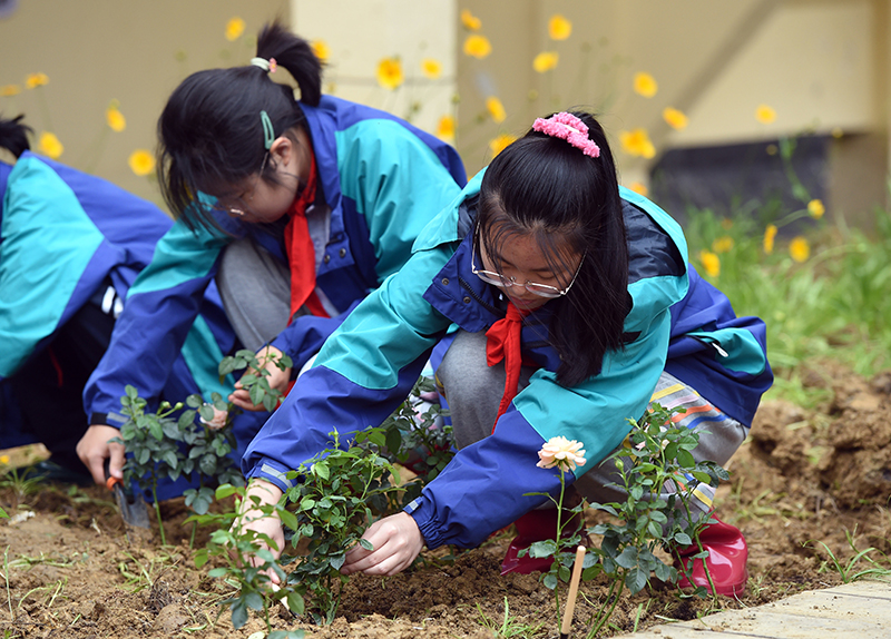 5月11日,合肥市一六八玫瑰园学校东校区的学生在劳动课上学习种植技能。