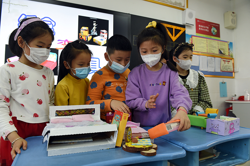 5月11日,合肥市一六八玫瑰园学校东校区的学生在劳动课上展示自己的手工作品。