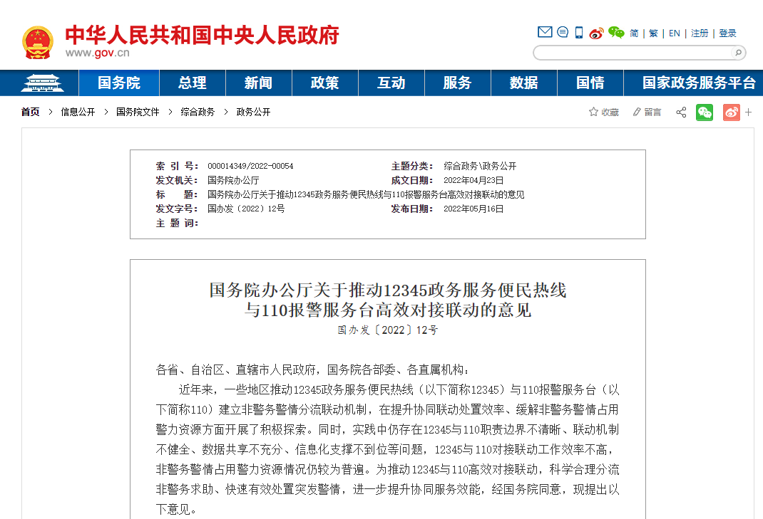 原标题:国办印发《意见》 推动全面实现12345与110平台互联互通