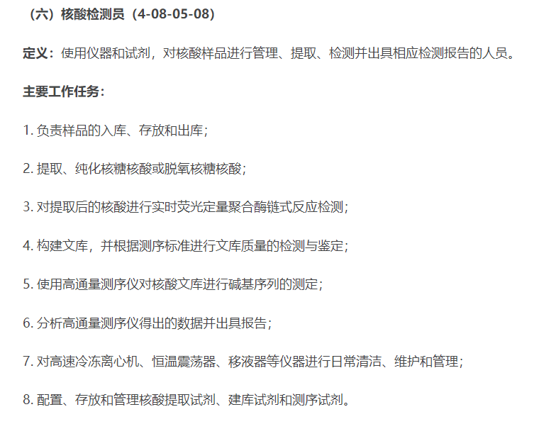 根据公示,“核酸检测员”定义为使用仪器和试剂,对核酸样品进行管理、提取、检测并出具相应检测报告的人员。