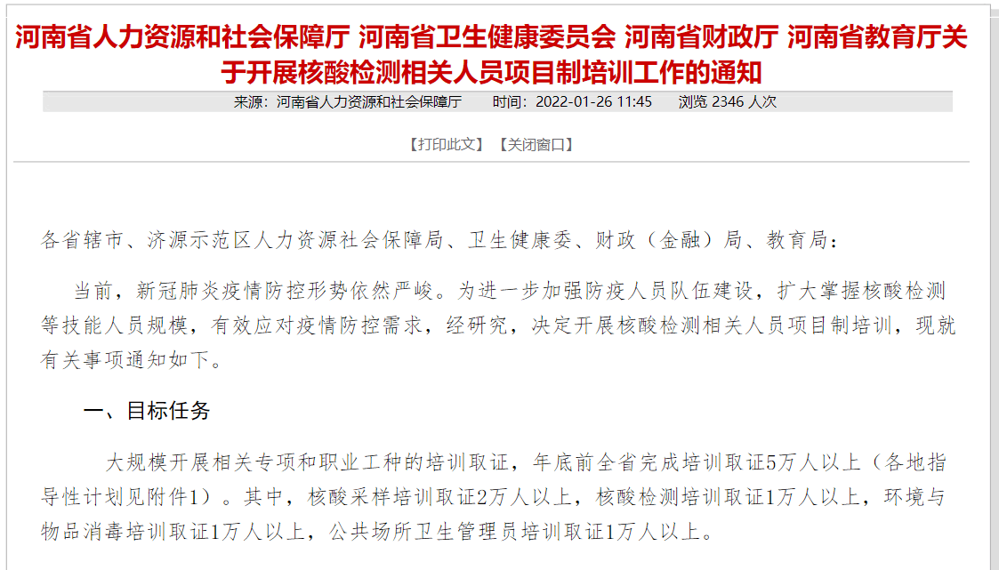 2022年初,河南省人社厅等多部门联合发布《关于开展核酸检测相关人员项目制培训工作的通知》,提出今年总目标为年底前全省完成培训取证5万人以上。其中,核酸采样培训取证2万人以上,核酸检测培训取证1万人以上,环境与物品消毒培训取证1万人以上,公共场所卫生管理员培训取证1万人以上。