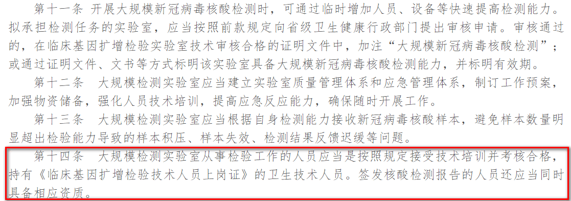 《关于印发大规模新冠病毒核酸检测实验室管理办法(试行)的通知》指出,大规模检测实验室从事检验工作的人员应当是按照规定接受技术培训并考核合格,持有《临床基因扩增检验技术人员上岗证》的卫生技术人员。签发核酸检测报告的人员还应当同时具备相应资质。