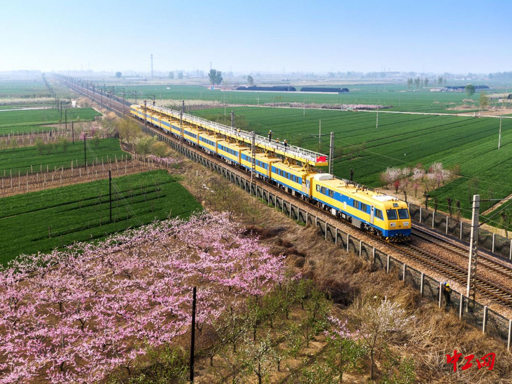 2021年4月8日,中国铁路北京局集团有限公司党内优质品牌——衡水供电段“党员先锋精修队”在石德线进行接触网集中修作业。蔚蓝的天空、绿油油的麦田、粉色的桃花、鲜艳的党旗、辛勤劳作的铁路人,构成了一幅绝美的画面,希望的田野上生机盎然。 徐刚 摄