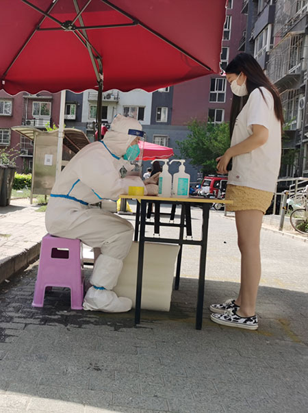 右安门街道总工会的李苗,带病坚持下社区,主动投入疫情防控工作中来,她经常顾不上吃饭,连续工作5-6个小时,滴水不进是常态。截至目前,共参与15轮核酸检测任务,累计服务11800余人次。