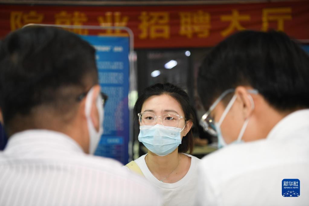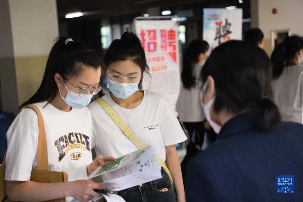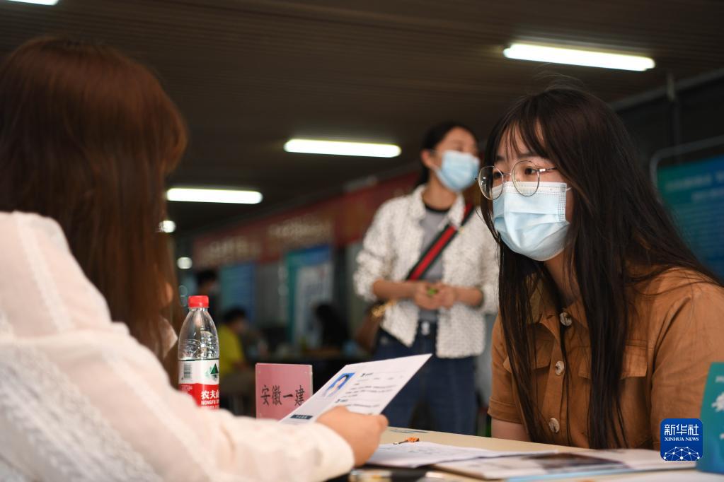 5月17日,在合肥学院内,求职者(中)向用人单位工作人员了解招聘信息。