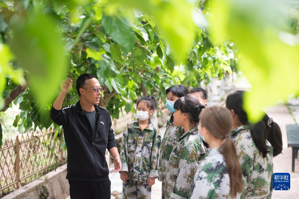 5月17日,在湖北省荆州市中小学生社会实践基地,学生上农作物认知课。