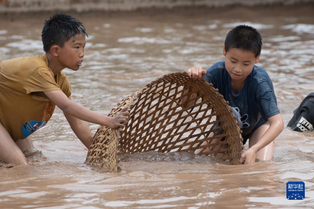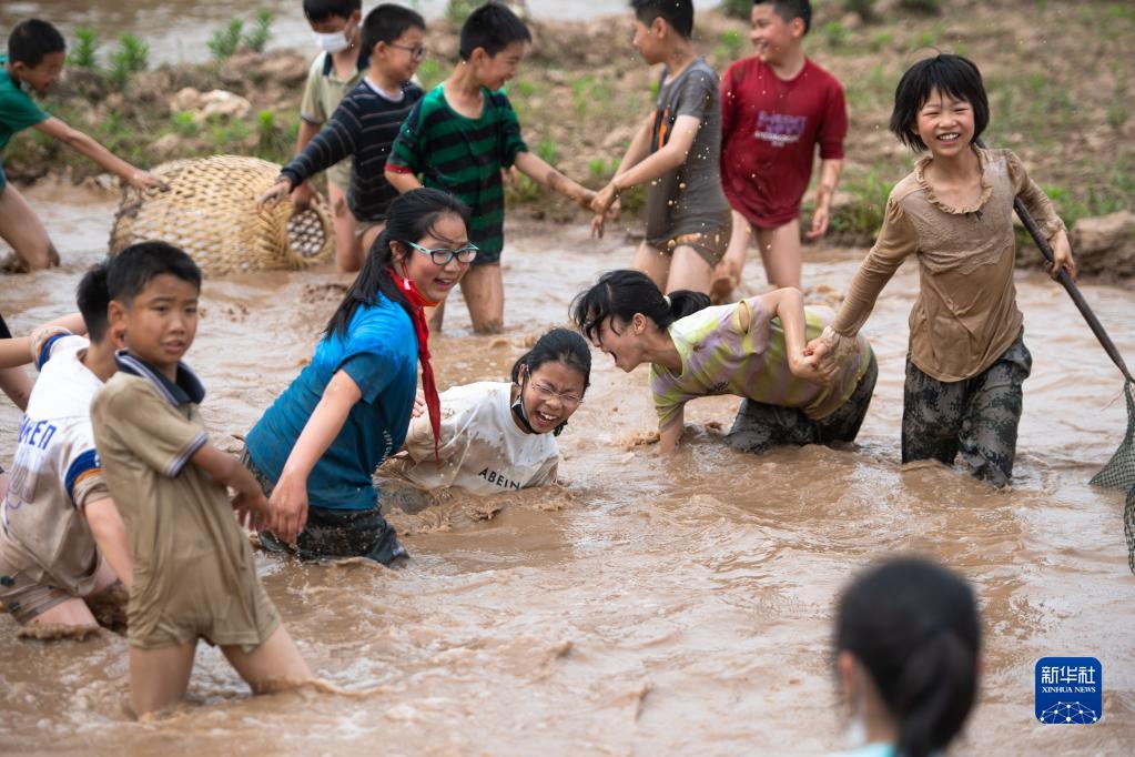 5月17日,在湖北省荆州市中小学生社会实践基地,学生体验鱼塘捕鱼。