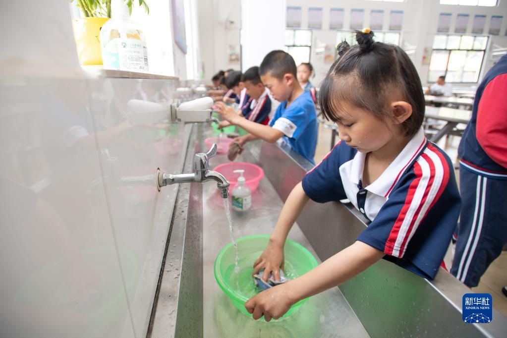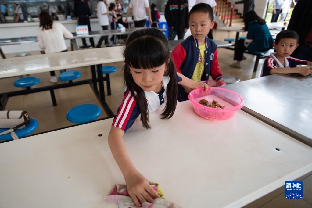 5月17日,在湖北省荆州市公安县杨家厂小学,轮值的学生参与食堂清洁劳动。