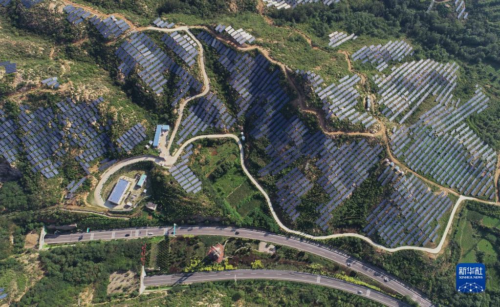 通往西柏坡的高速公路和西柏坡镇一处荒山上的光伏发电场(2019年8月16日摄,无人机照片)。 新华社记者 杨世尧 摄
