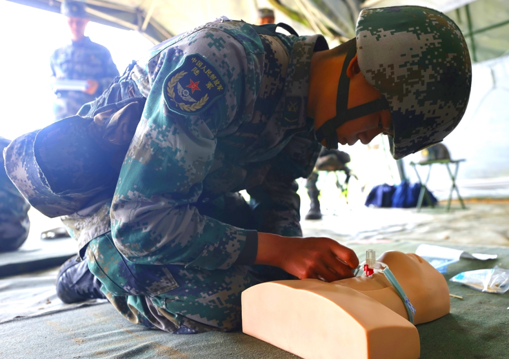 热食制作比武现场,炊事人员利用野战给养器材单元快速展开作业,打气点火、切菜配料、挥铲烹饪,每名比武人员分工明确,一场舌尖与刀尖上的精细较量激烈展开。