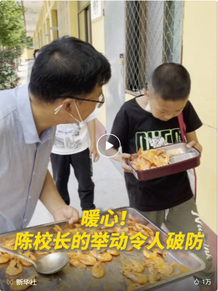 5月24日中午,大部分学生吃饱了,准备去午休,校长陈文水端着一盘大虾,四处看看还有没有需要添菜的同学。此时,角落里的学生玉堂引起了他的注意。玉堂饭盒里的大虾没被吃掉,但都被细心地剥去了皮,陈校长连忙上前询问:“吃饱了吗?为什么不吃大虾?”
