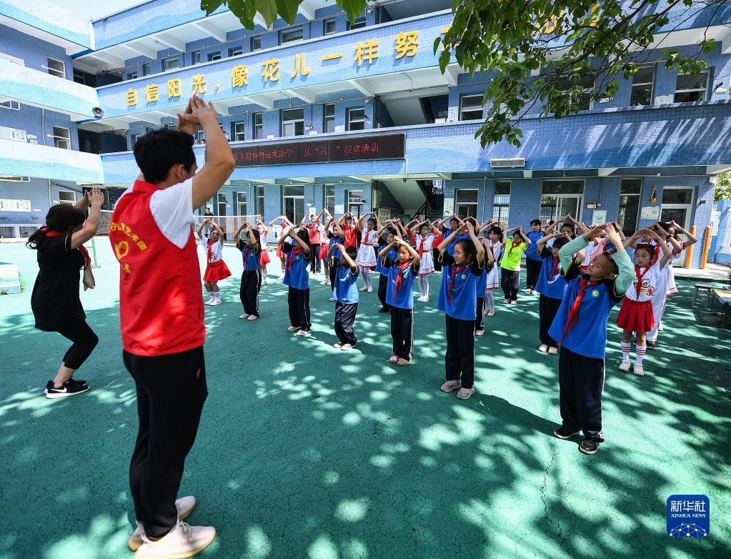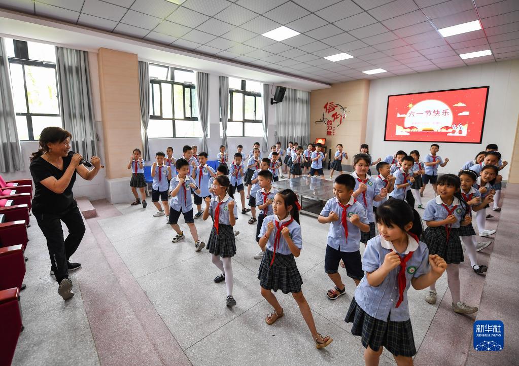 在中江县城西小学西山校区,刘春香(左一)在教孩子们跳儿童防性侵害操(5月30日摄)。
