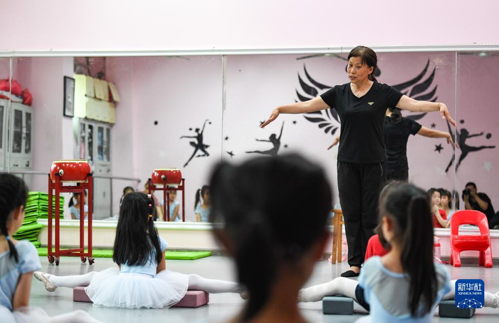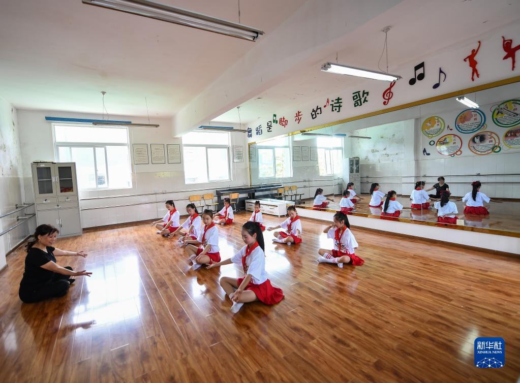 在四川省中江县留守儿童艺术团,刘春香(后右)和艺术团教师杜丽娅(前)在教孩子们学习舞蹈(5月29日摄)。