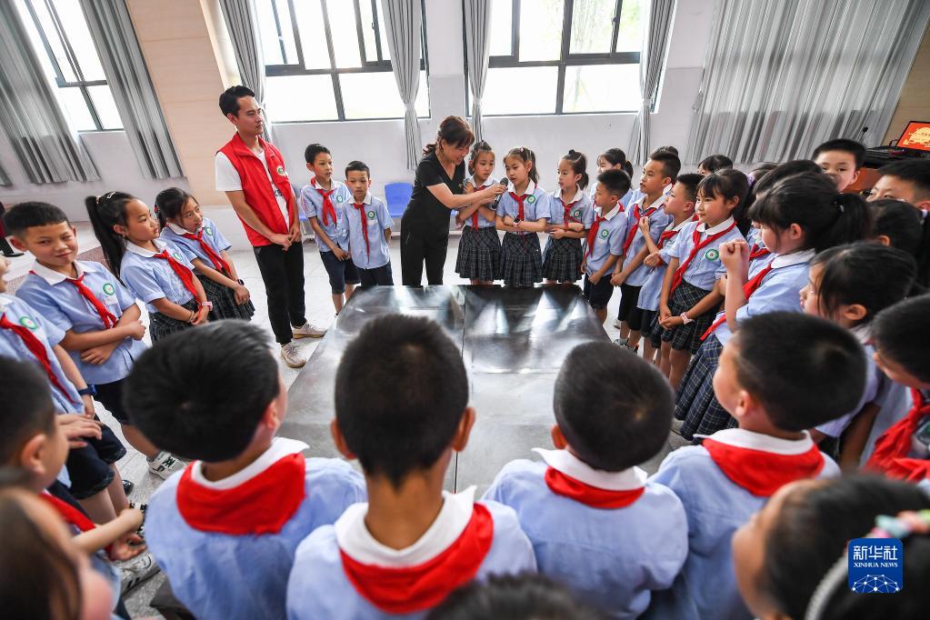 在四川省中江县城西小学西山校区,刘春香(后中)和孩子们进行知识问答互动(5月30日摄)。
