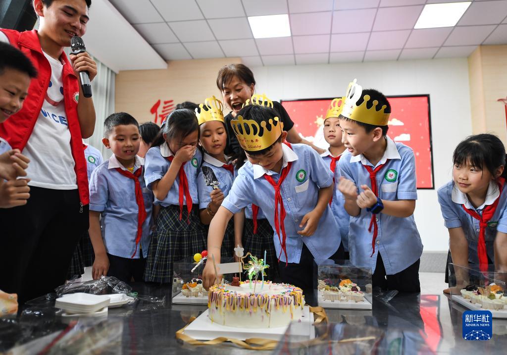 在四川省中江县城西小学西山校区,刘春香(后)和艺术团教师秦范(左二)给孩子们过集体生日(5月30日摄)。