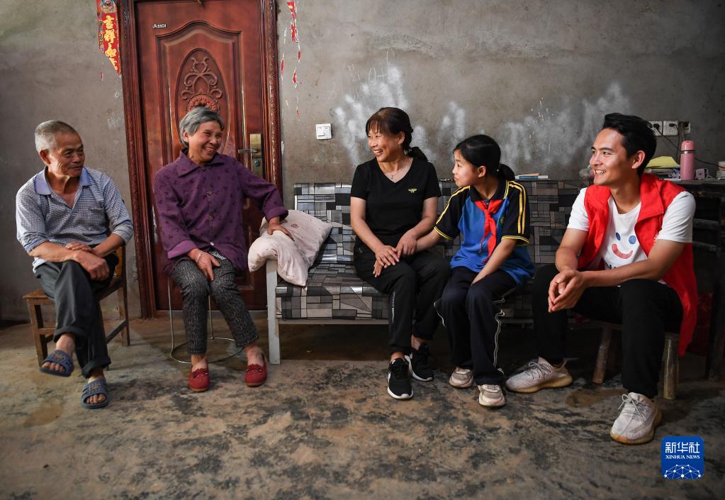 刘春香(中)和艺术团老师秦范(右一)到学生杨歆玥(右二)家中家访(5月29日摄)。