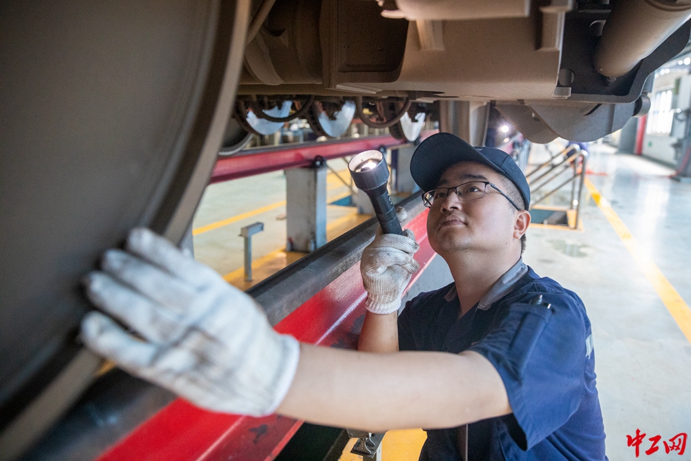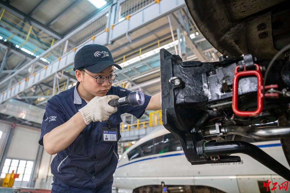 安徽省合肥市包河区的合肥南动车运用所里,身着蓝色工服的动车检修机械师们,在检修库内挥洒汗水,做好每一道工序,用踏实与认真保障每一辆动车组的安全运行。 葛飞 摄