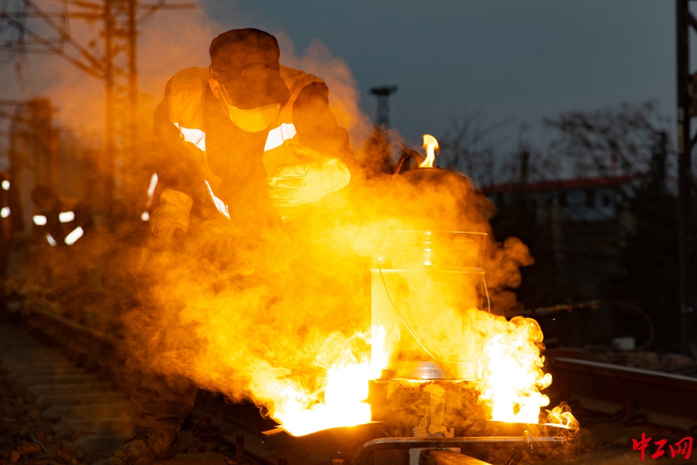 为了保证铁路钢轨铝热焊质量,防止跑锅现象发生,钢轨焊接工往往需要直面千度烈焰,密切注视炉内反应。图为石家庄工务段的钢轨焊接工在紧张的天窗时间内进行钢轨焊联,确保万无一失。 李晓川 摄