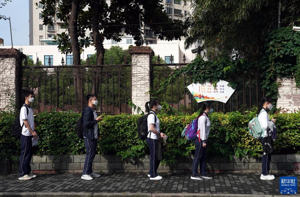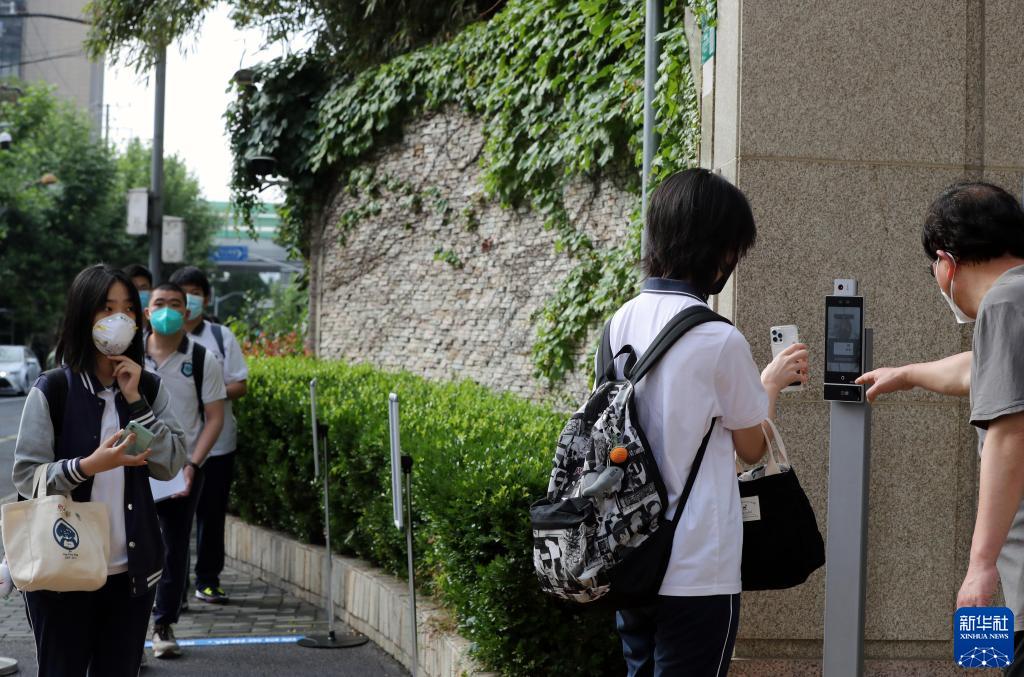 6月6日,上海外国语大学附属大境中学的学生们依次排队等待入校。