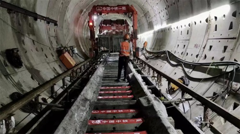 中铁一局集团承担着首通段3221标段26.5公里铺轨、27组道岔的铺设任务。“自进场以来,项目部采取分段施工的方法,施工高峰期投入400余人、轨道车5组,铺轨门吊18台,以日均浇筑380米的速度持续向前推进,有效确保了各节点目标的按时实现。针对全线道床类型复杂、技术标准、降噪要求高等情况,项目部多措并举,在轨道道床方面特殊地段采用了钢弹簧浮置板轨道,减少列车对周边环境的振动影响,钢轨焊接完成后对钢轨进行了钢轨打磨,双重减振降噪技术确保后期运营列车在运行过程中对周边的噪声、振动影响更小,提高乘客乘坐地铁的舒适度。”项目负责人苏俊伟介绍道。