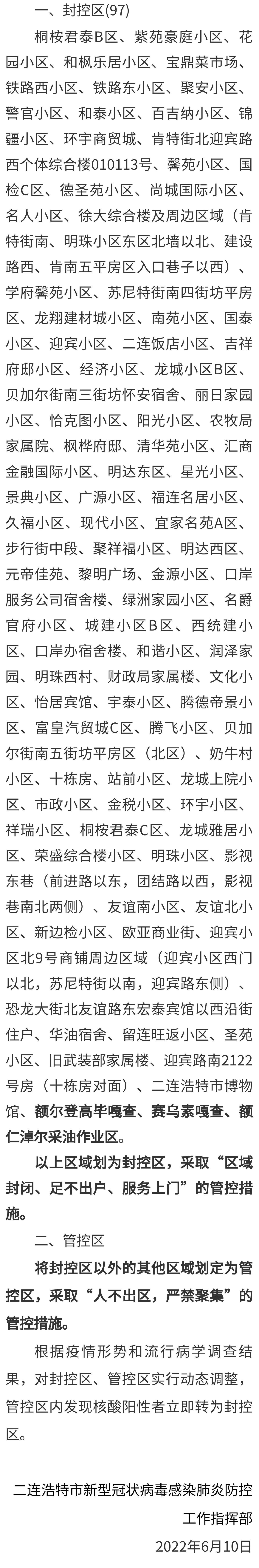 根据国务院联防联控机制《关于调整新冠肺炎疫情分区分级标准实施精准管控措施的通知》(国电发〔2020〕11号)要求和《内蒙古自治区新型冠状病毒肺炎疫情防控应急预案(第六版)》(内防指发〔2022〕6号)的规定,经自治区、锡林郭勒盟流调专家组根据流行病学调查结果研判,将额尔登高毕嘎查、赛乌素嘎查、额仁淖尔采油作业区划定为封控区,封控区范围增至97个,具体情况如下: